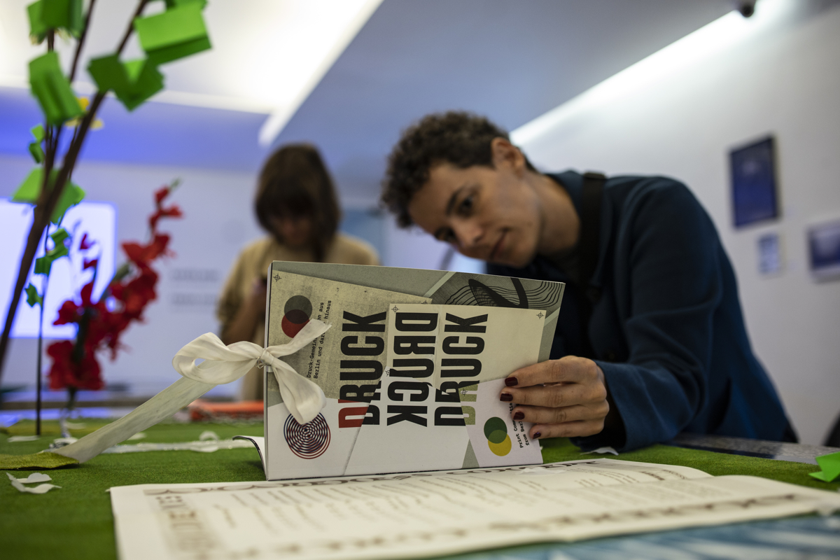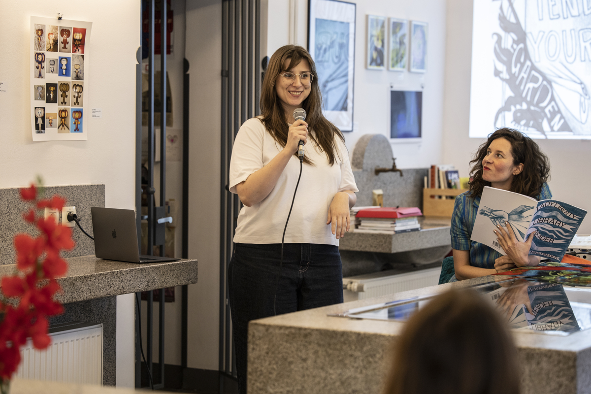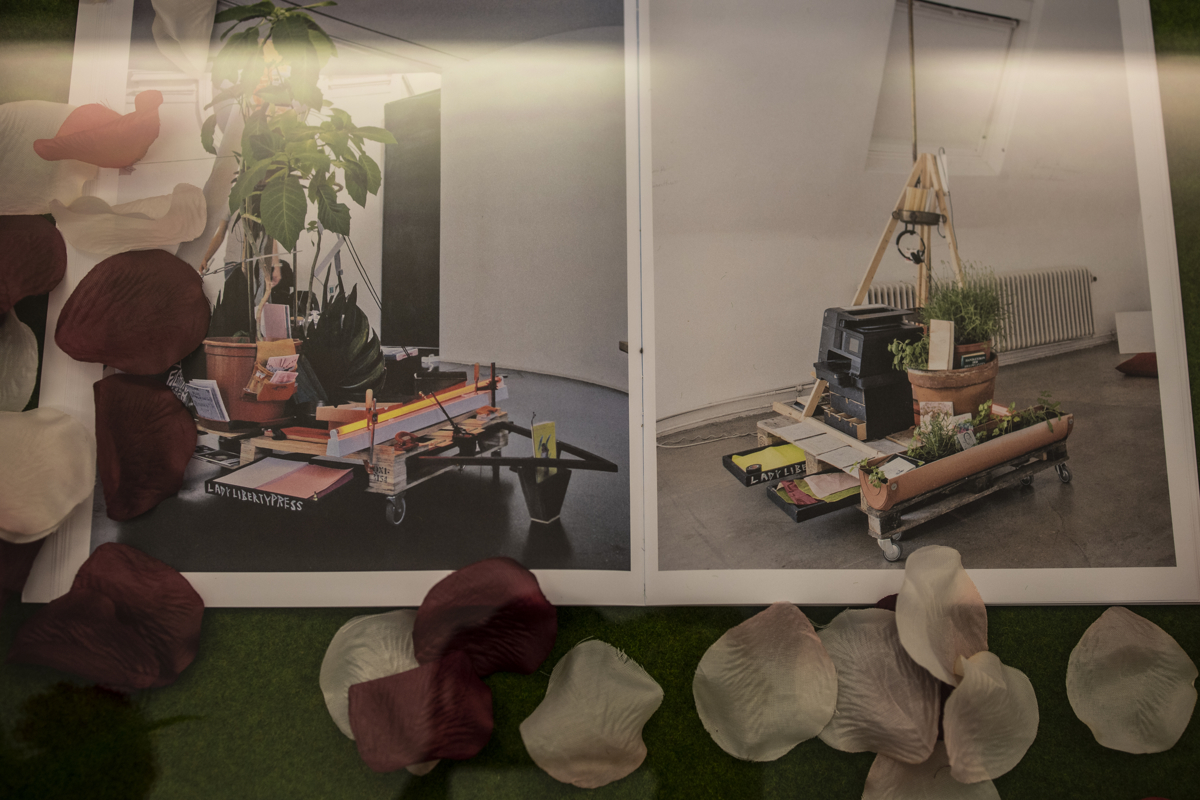 Nina Prader a.k.a. Lady Liberty Press is an artist, writer, curator, mentor, independent publisher — or in short, an artist-librarian at large between Vienna, Berlin, and the world. Born in Washington, DC, she studied at the Museum School of Fine Arts in Boston in affiliation with Tufts University and at the Slade in London in affiliation with UCL. She received her MA in Critical Studies at the Academy of Fine Arts in Vienna. She has exhibited and written internationally in Boston, New York, Vienna, Salzburg, Berlin, and London. Her most recent projects include graphic novel artist books, printed by Risograph, and directing the Lady Liberty Library project. This year, she celebrates 10 years of Lady Liberty Press & Library activities on printed matters. (Photo: Malte Spindler)