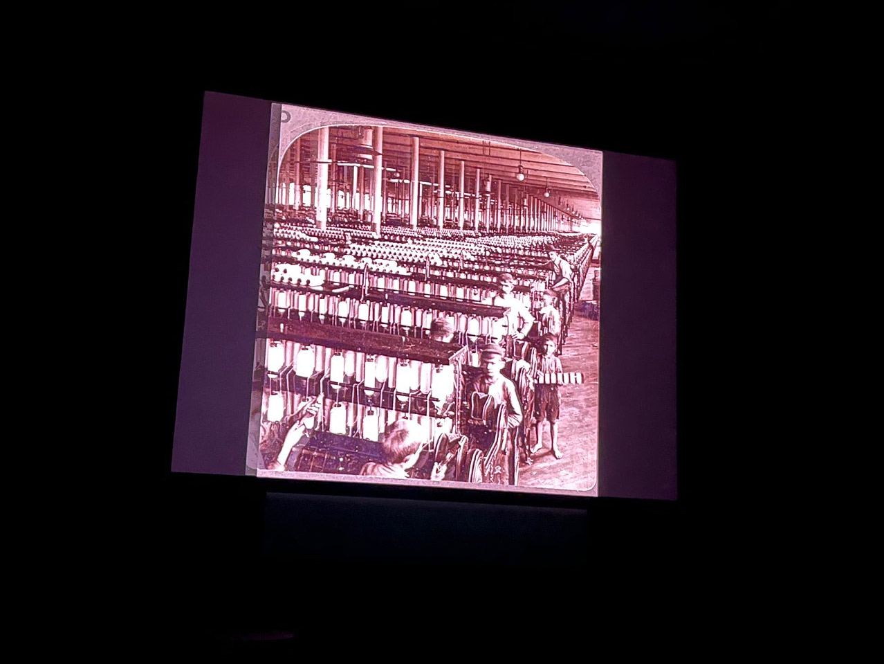 A stereograph celebrating factory production of thread. Many bobbins of thread coil in a great sky-lit factory space, the many machines manned by a handful of people. Manned? Some are children. I activate the double-photograph to elicit a degree of 3D, composer Rick Reed suggests the relentless machine din. Your heart bleeding for the kids? The children will surely be rescued and by their bosses! “Boys”, they will say, “Have we got a war for you!”