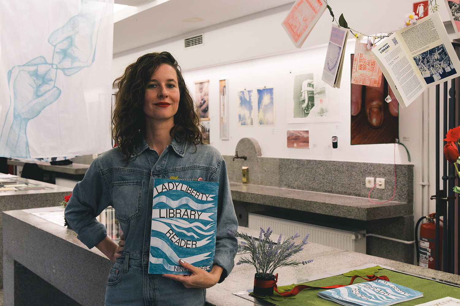 Nina Prader a.k.a. Lady Liberty Press is an artist, writer, curator, mentor, independent publisher — or in short, an artist-librarian at large between Vienna, Berlin, and the world. Born in Washington, DC, she studied at the Museum School of Fine Arts in Boston in affiliation with Tufts University and at the Slade in London in affiliation with UCL. She received her MA in Critical Studies at the Academy of Fine Arts in Vienna. She has exhibited and written internationally in Boston, New York, Vienna, Salzburg, Berlin, and London. Her most recent projects include graphic novel artist books, printed by Risograph, and directing the Lady Liberty Library project. This year, she celebrates 10 years of Lady Liberty Press & Library activities on printed matters. (Photo: Malte Spindler)